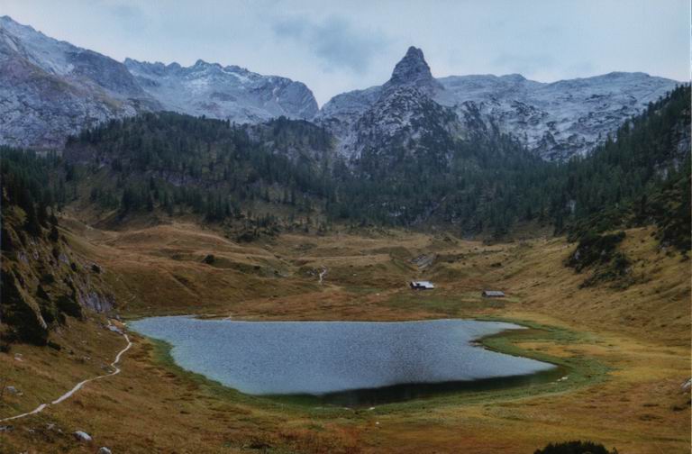 Blick vom Kärlingerhaus auf den Funtensee. Der auffällige Berg in der Bildmitte ist das Schottmalhorn (2232 m). Sein Gipfel liegt genau auf der Deutsch-Österreichischen Grenze.