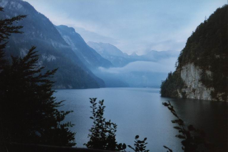 | Der Malerwinkel gehört zu den am meisten fotografierten Motiven am Königssee. Der Blick reicht vom Nordende des Sees über die fünf Kilometer entfernte Halbinsel Bartholomä zum Steinernen Meer. Die markante pyramidenförmige Spitze, hier etwas im Morgennebel, ist die Schönfeldspitze (2659 m). Das Bild entstand etwa 7 Uhr morgens. |