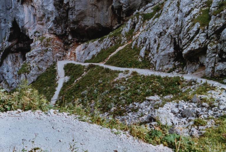 Blick auf einige Kehren der Saugasse. Es ist in Wirklichkeit noch etwas steiler als es hier aussieht.