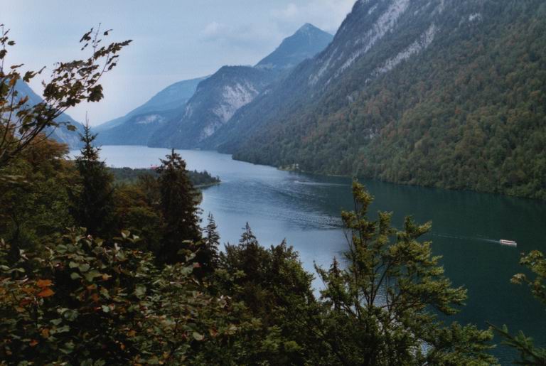 | Blick nach Norden auf den Königssee. Der an eine ägyptische Pyramide erinnernde Gipfel ist der Jenner (1874 m). Links von der Bildmitte ist das rote Dach der Wallfahrtskirche St.Bartholomä zu erkennen. |
