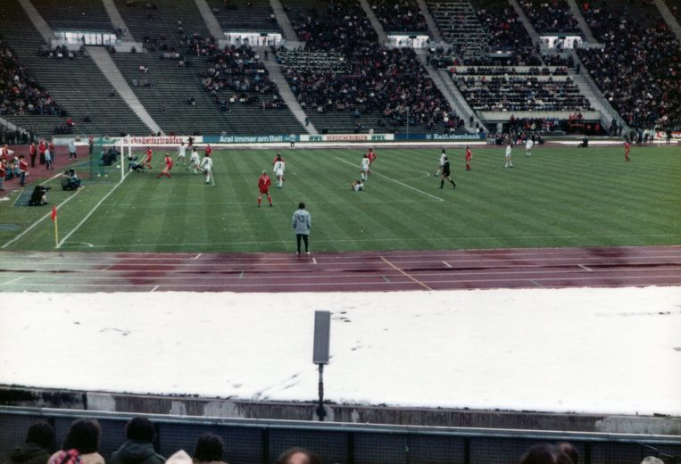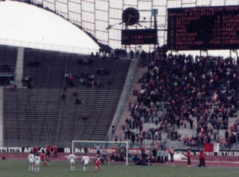 Es war einmal... Die folgenden Bilder habe ich am 26. Februar 1983 im Münchner Olympiastadion bei einem Bundesligaspiel Bayern München - Arminia Bielefeld aufgenommen. Ich lege übrigens Wert auf die Feststellung, dass ich kein Bayern-Fan bin. Das Spiel endete vor 12000 Zuschauern 5:0. Einzelheiten zum Spiel findet man unter http://www.fussballdaten.de/bundesliga/1983/22/bmuenchen-bielefeld/. |