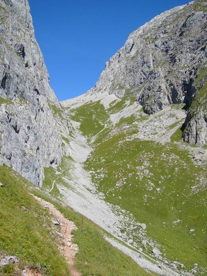 | Es ist kaum vorstellbar, aber in dieser öden Gegend gab es bis vor 100 Jahren noch Hochalmen! (Z.B.: Landtal-Alm, Kahlersberg-Alm, Bärensunk-Alm) Wie die armen Viecher da wohl raufgescheucht wurden? Kein Wunder, dass in dieser Gegend eigens eine Rinderrasse entstand, die sog. "Berchtesgadener Katzen", die besser als die heutigen auf Milchproduktion optimierten Hochleistungskühe in der Lage waren, über Stock und Stein Wege zurückzulegen. |