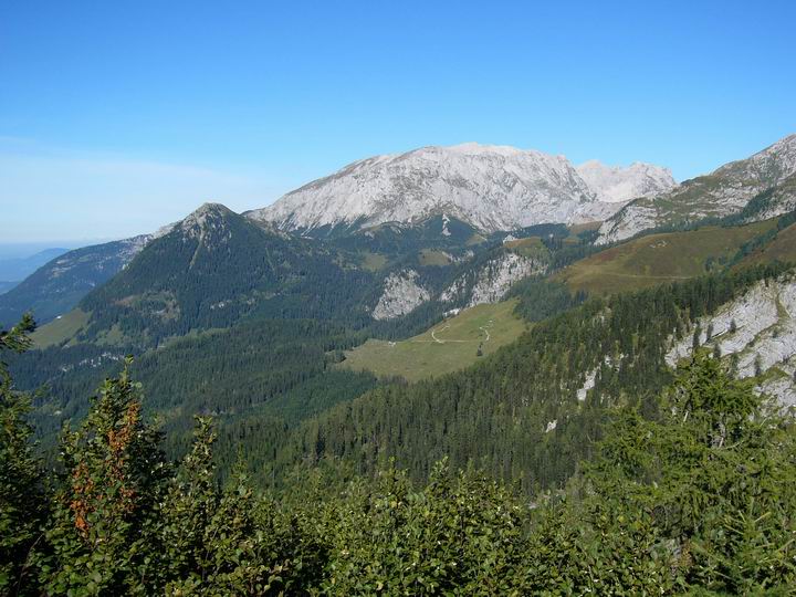 In der Nähe des berühmten Aussichtspunktes Feuerpalfen hat man diesen Blick nach Nordosten auf den Jenner, das Hohe Brett und den Hohen Göll.