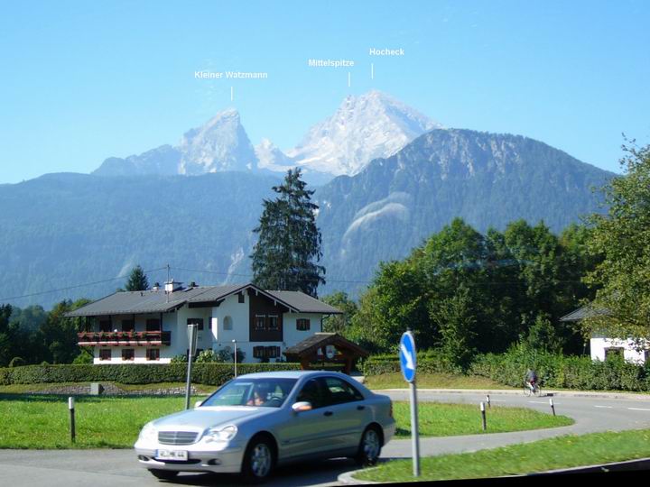 | Der Kleine und der Große Watzmann, dazwischen das Watzmann-Kar mit den Watzmann-Kindern. Von Berchtesgaden aus gesehen ist die Südspitze des Großen Watzmann verdeckt. Der Berg rechts im Vordergrund ist der Grünstein (1304m). |