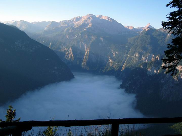 Von der Archenkanzel aus hat man normalerweise einen phantastischen Tiefblick zum Königssee. Um diese Zeit (etwa 8.00 Uhr morgens) lag der See aber noch in Wolken.