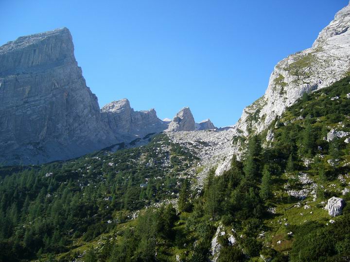| Vom Falzsteig aus hat man diesen Blick ins Watzmann-Kar mit den Watzmann-Kindern. Der Falzsteig ist ein bisschen unangenehm zu gehen. An zwei Stellen muß man sich an einem an der Felswand befestigten Drahtseil festhalten. |