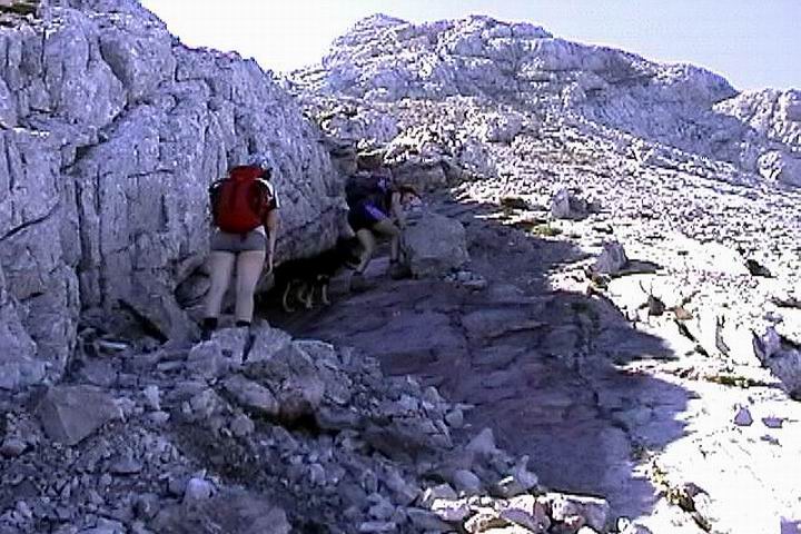 Zwei Damen mit Hund beim Aufstieg zum Hocheck. Dem Hund hats Spaß gemacht.