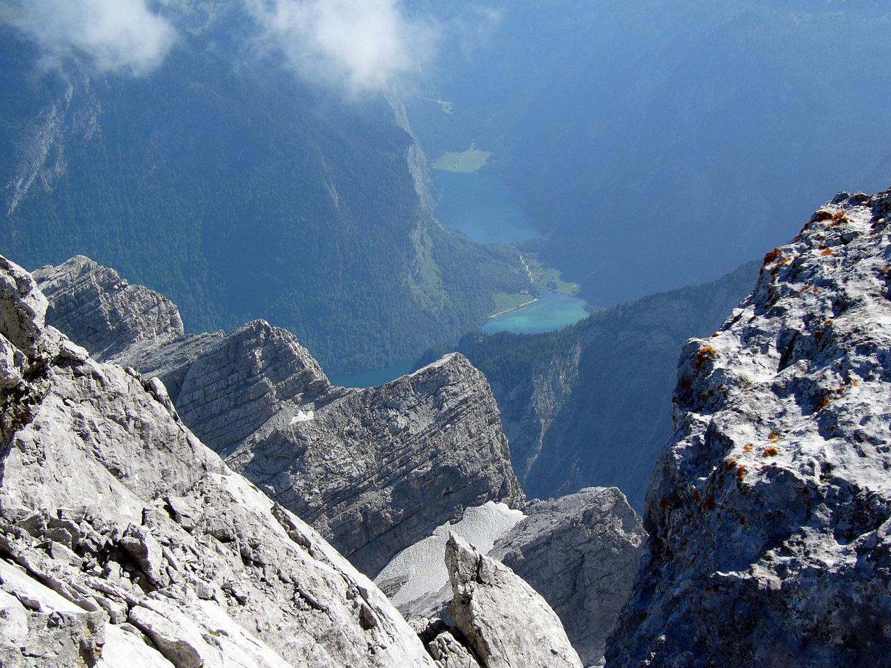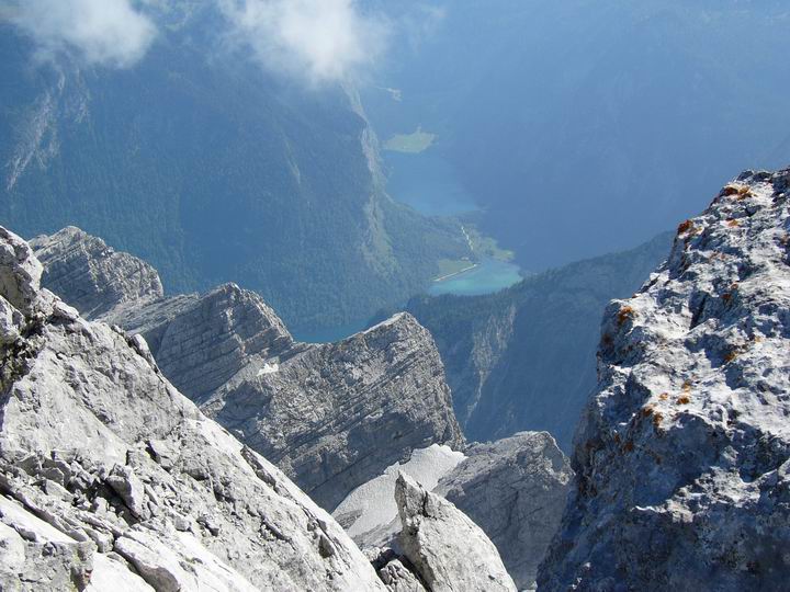 Blick durch die Watzmann-Kinder hindurch auf das Südende des Königssees und den dahinterliegenden Obersee. Das Bild kann durch anklicken vergrößert heruntergeladen werden.