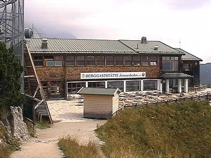 Die Bergstation der Jennerbahn mit Gaststätte. Das Metallgerüst auf der linken Seite ist ein Eiskletterturm.