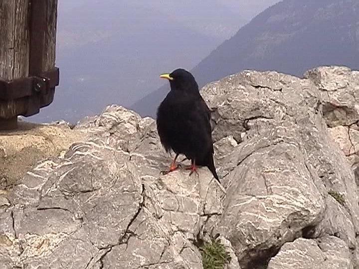 Eine Alpendohle (Pyrrhocorax graculus). Sie wird knapp 40 cm groß. Kennzeichnend sind der gelbe Schnabel, die orange-roten Beine und das freche Benehmen.