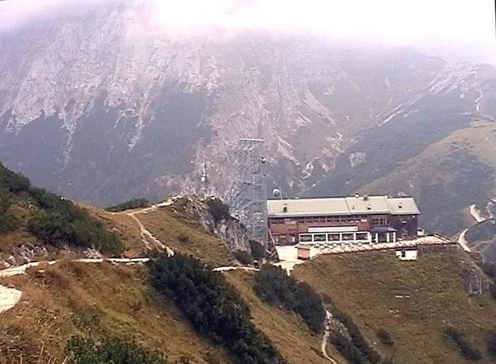 Die Bergstation der Jennerbahn mit Gaststätte. Der Berg dahinter ist das hohe Brett (2340 m). Das Metallgerüst auf der linken Seite ist ein Eiskletterturm. Der Weg links führt auf den Jenner-Gipfel.