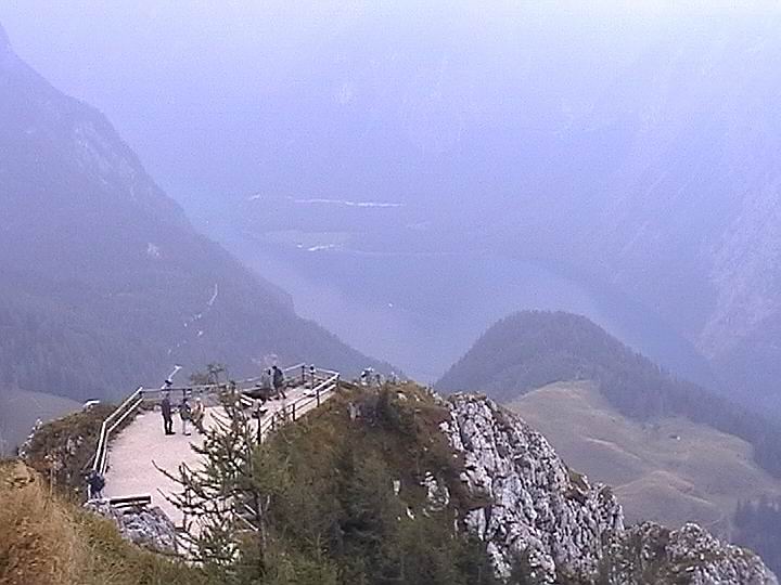Blick vom Jenner-Gipfel auf den Königssee. Man erkennt die Halbinsel St.Bartholomä. Die Ostwand des Watzmann dahinter liegt im Dunst.