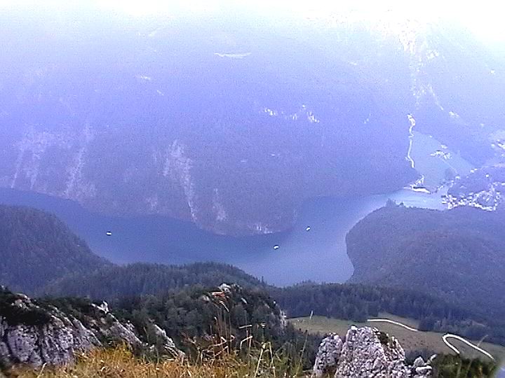 Blick vom Jenner-Gipfel auf den Königssee mit der Kreuzelwand. Rechts daneben sieht man die Olympia-Bobbahn, weiter rechts das Dorf Königssee.